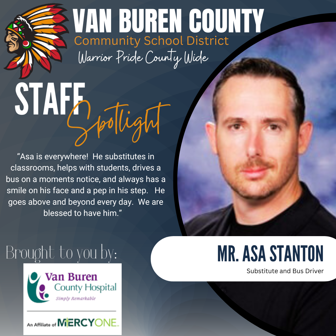 Van Buren County CSD is excited to partner with the Van Buren County Hospital to recognize our hardworking teachers and staff! Each month an individual, or group of individuals, will be recognized for their commitment and dedication to Van Buren County CSD.